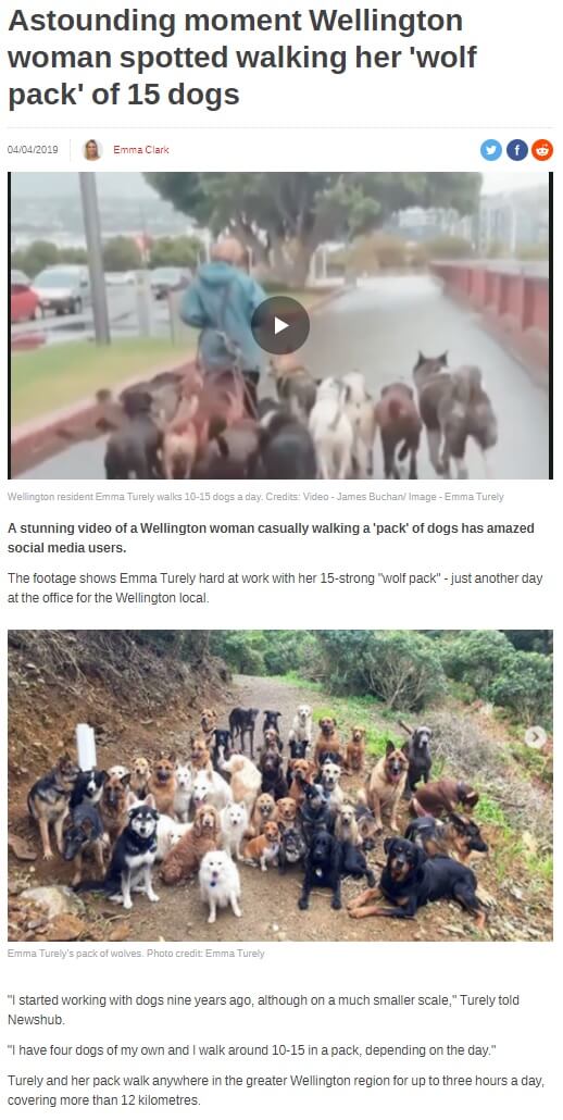 Wellington şehrinde köpek gezdiriciliği yapan Emma Turely, kendisine ait 4 köpeğin olduğunu, günde 10-15 köpeği 3 saat civarında gezdirdiğini belirtmiş. Yani, paylaşılan görseldeki köpekler sanıldığı gibi “sahipsiz” değil.