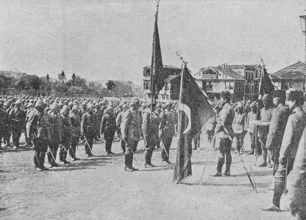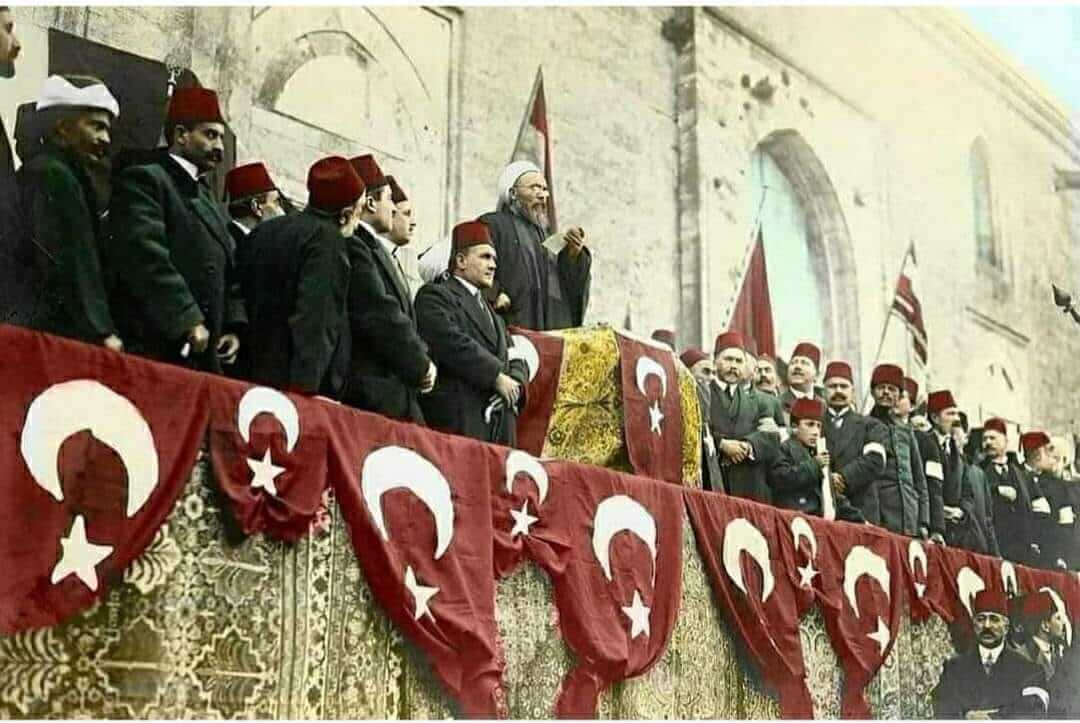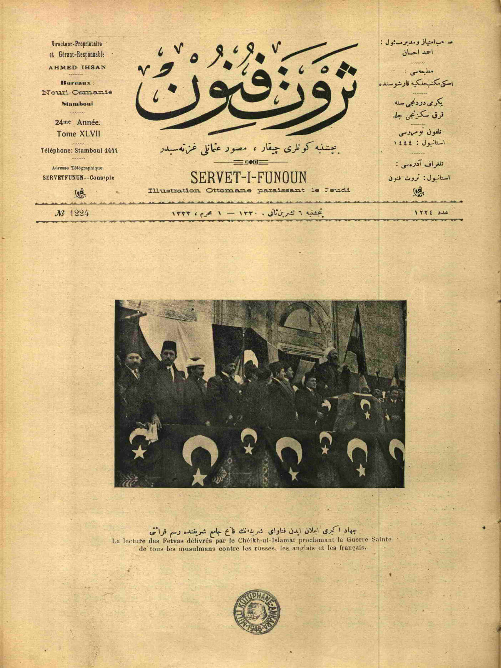 11 Kasım 1914 tarihinde Sultan V. Mehmet Reşat’ın cihat ilanıyla Osmanlı İmparatorluğu’nun 1.Dünya Savaşına dahil olmasından sonra Fatih Camii’nde 11 Kasım 1914 tarihinde ve akabindeki 3 günde Fetva Emini Ali Haydar Efendi’nin padişah ve halife adına yaptığı cihat ilânında da bayraklar ters değildi.