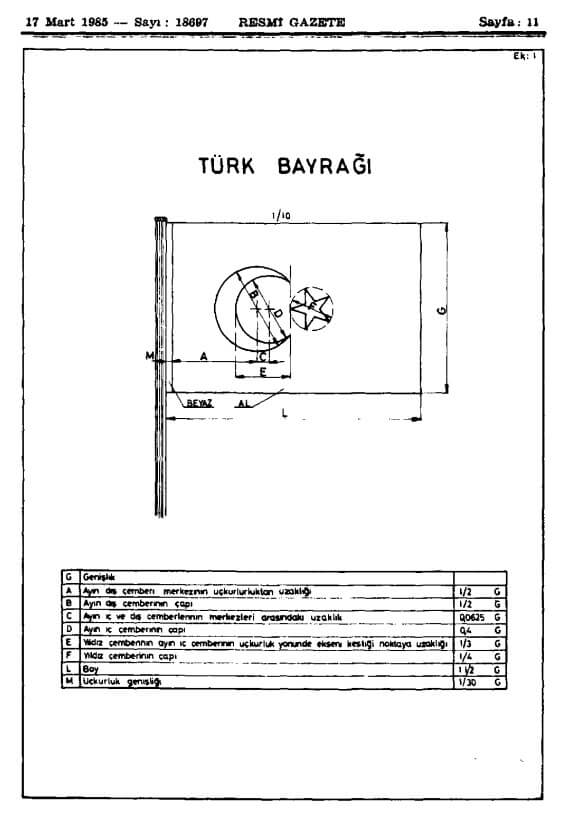 Türk Bayrağı, Türk Bayrağı Kanunu’nun ekindeki cetvelde gösterilen şekil ve oranlarda olmak zorundadır.