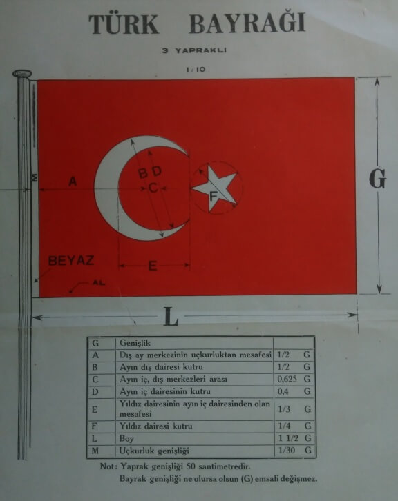 Osmanlı İmparatorluğu döneminde ve Kurtuluş Savaşı’nda kullanılan bayrak biçimi Cumhuriyet döneminde de aynen yasalaştırılmıştır.