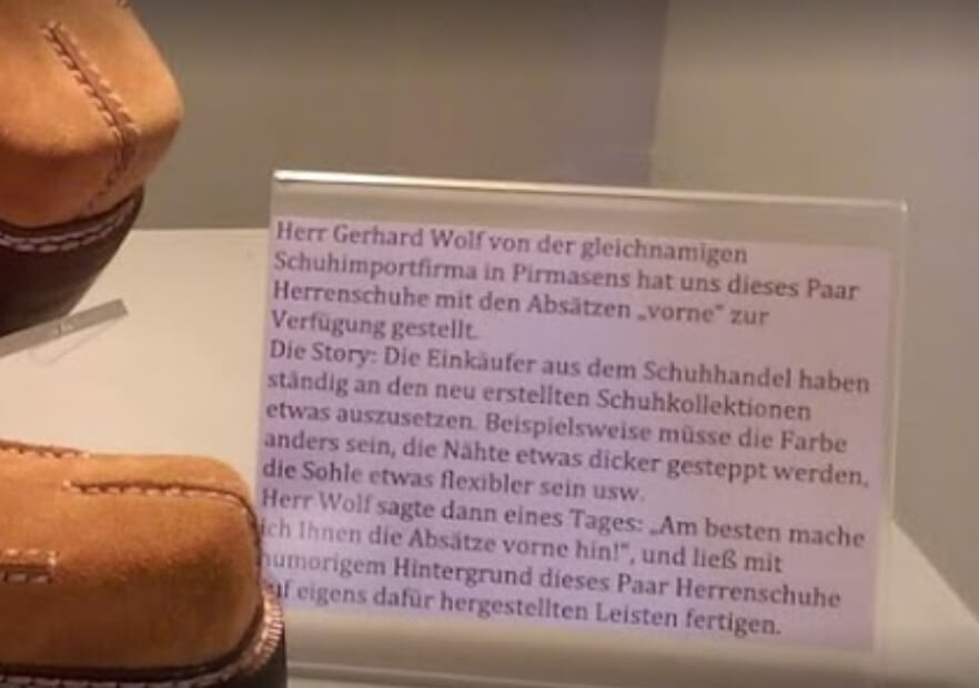“Herr Gerhard Wolf von der gleichnamigen Schuhimport Firma in Pirmasens hat uns dieses Paar Herrenschuhe mit den Absatzen ‘vorne’ zur Verfühunh gestellt. Die Story: Die Einkaufer aus dem Schuhhandel haben standig an den neu erstellten Schuhkollektionen etwas auszusetzen.Beispielsweise müsse die Farbe anders sein, die Nahte etwas dicker gesteppt werden, die Sohle etwas flexibler sein usw. Herr Wolf sagte dann eines Tages: ‘Am besten mache ich ihnen die Absatze vorne hin!’, und ließ mit humorigem Hintergrund dieses Paar Herrenschuhe auf eigens dagür hergestellten Leisten fertigen.”