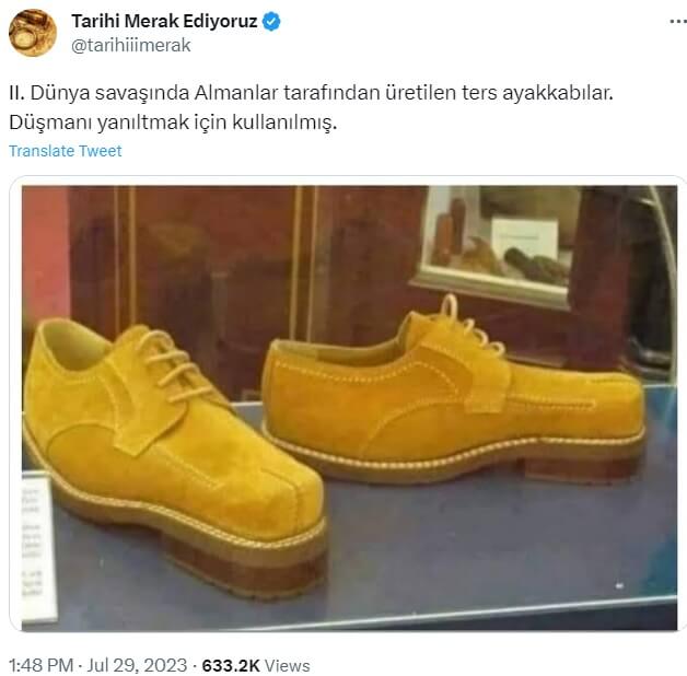 “Dost başa düşman ayağa bakar” atasözünü hatırlatan görseldeki ters tabanlı ayakkabılar Nazi Almanyasına ait kuvvetler tarafından 2. Dünya Savaşı esnasında düşman askerlerini yanıltmak için üretilmemiş.