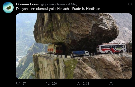 Örneğin, sosyal medyada ve haber sitesi galerilerinde dünyanın en ölümcül yolu olarak nitelenen Himachal Pradesh, Hindistan’dan ya da Karakoram, Pakistan’tan olduğu iddiasıyla paylaşılan fotoğraf 2 farklı görselin birleşimiyle oluşturulmuştu.