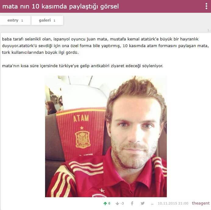 İspanyol futbolcu Juan MATA’nın 10 Kasım nedeniyle “ATAM” yazılı atkı ile fotoğraf paylaştığı yönünde 2014 yılında bir trolleme denemesi gerçekleştirilmişti.