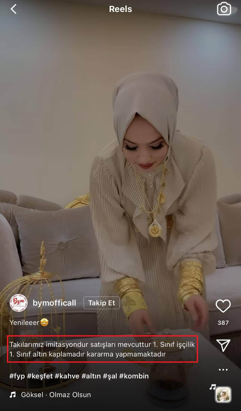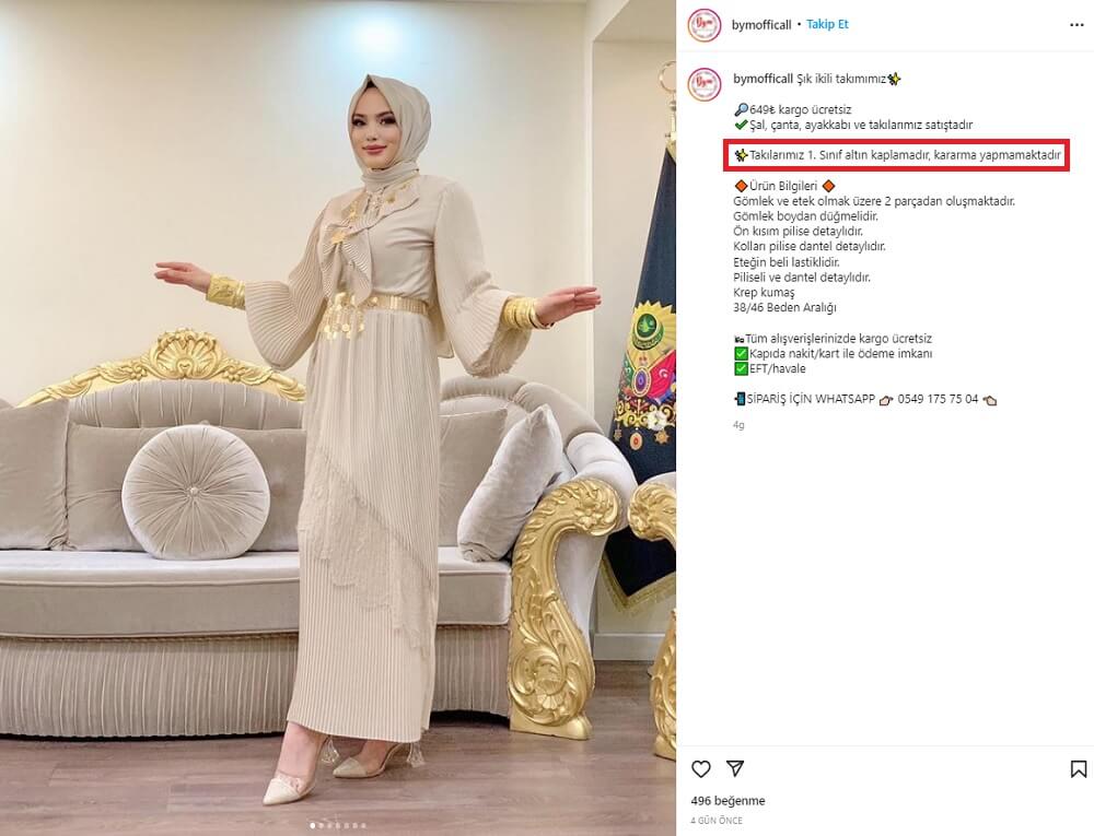 İstanbul Fatih Mercan’da toptan ve perakende mağazaları bulunan BYM Fashion adlı firma söz konusu videoyu “Takılarımız 1. Sınıf altın kaplamadır, kararma yapmamaktadır” ve “takılarımız imitasyondur satışları mevcuttur 1. Sınıf işçilik 1. Sınıf altın kaplamadır kararma yapmamaktadır” notuyla paylaşmıştı.