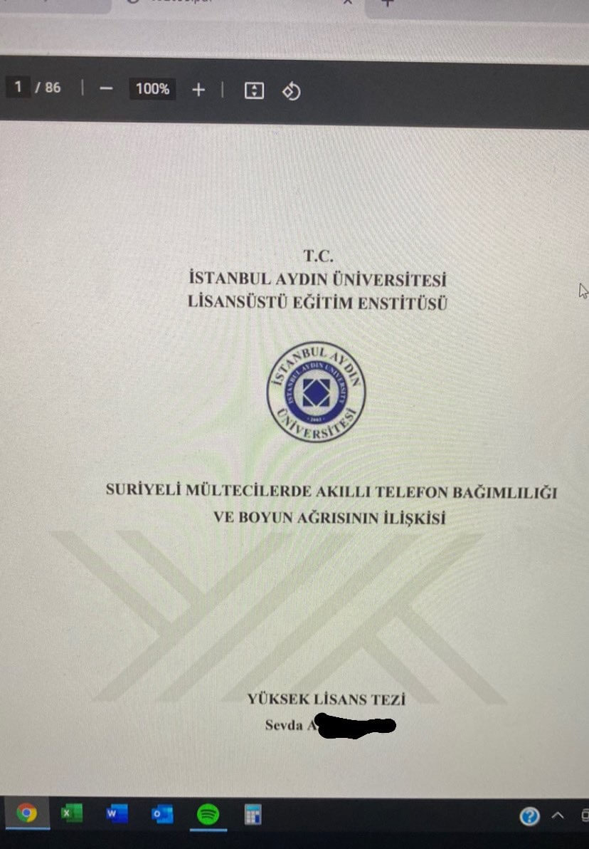 Benzer şekilde, sosyal medyada şüphe ile karşılaşan “Suriyeli mültecilerde akıllı telefon bağımlılığı ve boyun ağrısının ilişkisi” başlıklı tez kapağı görselinin İstanbul Aydın Üniversitesi Fizyoterapi ve Rehabilitasyon Ana Bilim Dalı Fizyoterapi ve Rehabilitasyon Bilim Dalında Sevda Zengin tarafından 2020 yılında hazırlanan yüksek lisans tezi olduğu da Ulusal Tez Merkezi üzerinden anlaşılabiliyor.