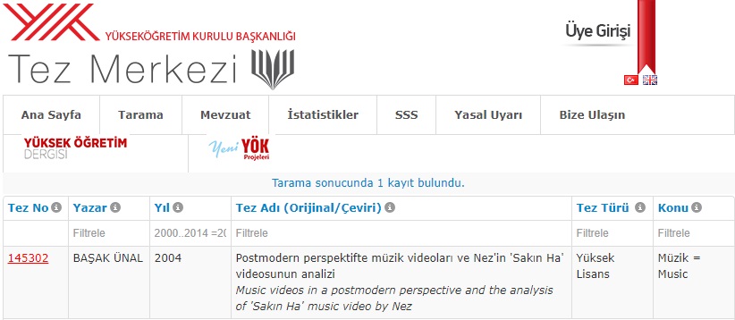 “Postmodern perspektifte müzik videoları ve Nez’in ‘Sakın Ha’ videosunun analizi” başlıklı tezin GERÇEK olduğunu yine YÖK Tez Merkezi sorgusuyla tespit mümkün.
