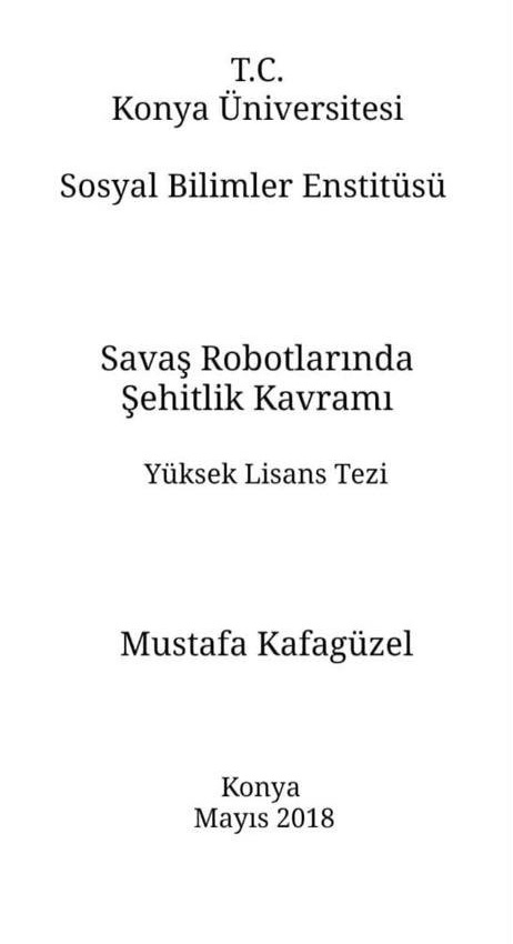Konya Üniversitesi Sosyal Bilimler Enstitüsü’nde öğrenim gören Mustafa Kafagüzel’e ait olduğu iddiasıyla “Savaş Robotlarında Şehitlik Kavramı” başlıklı bir yüksek lisans tez kapağı görselinin sosyal medyada yeniden dolaşıma sokulduğuna şahit olmuştuk.