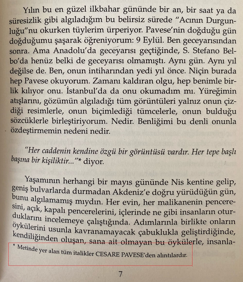 Tezer Özlü ise tüm hayatını tuhaf biçimde ele geçiren Pavese için kendisine yöneltilen “Neden Pavese?” sorusuna “Pavese’nin doğduğu gün doğduğumu şaşarak öğreniyorum: 9 Eylül. Ben gece yarısından sonra. Ama Anadolu’da gece yarısı geçtiğinde, S, Stefano Beblo’da henüz belki de gece yarısı olmamıştı. Aynı gün. Aynı yıl değilse de. Ben onun intiharından yedi yıl önce. Kimse her insanın yaşamının ortak yanları olduğunu düşünmüyor. Özlem. Acı. Diğer sözcükleri kullanmıyorum. Bu kahrolası yeryüzünün o büyük yalnızı. Onu ne denli seviyorum.” şeklinde cevap vermiştir.