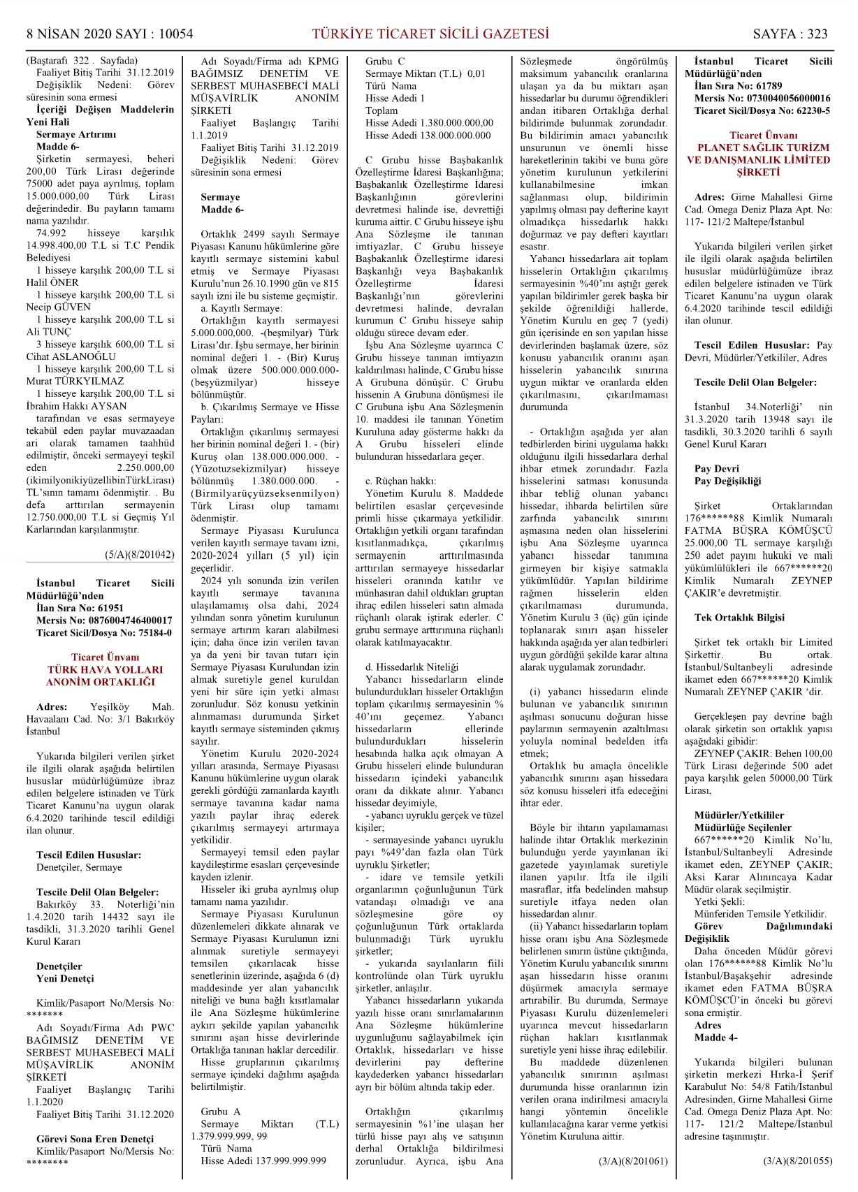08 Nisan 2020 tarih 10054 nolu Türkiye Ticaret Sicil Gazetesi’nde (TTSG) yayımlanan THY Esas Sözleşmesi’nde bu husus “yabancı hissedarların elinde bulundurdukları hisseler ortaklığın toplam çıkarılmış sermayesinin % 40’ını geçemez.” cümlesiyle aktarılmış.