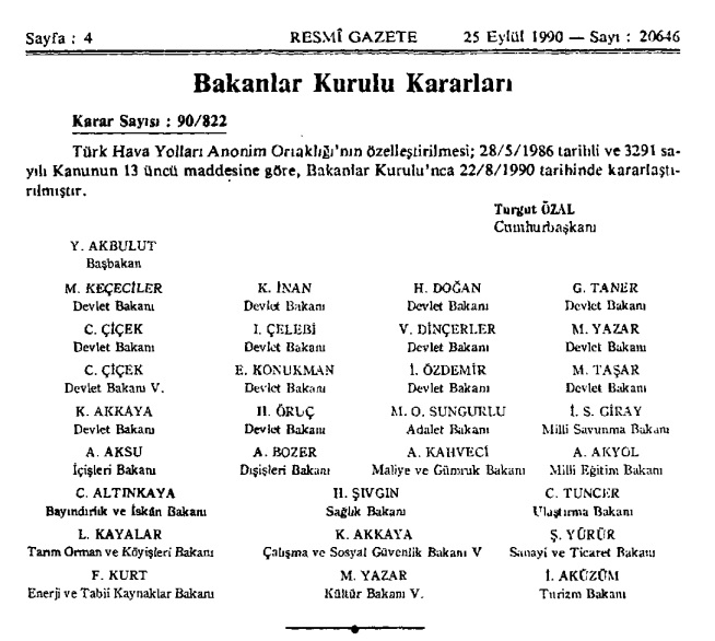 THY’nin özelleştirilmesine dair 22 Ağustos 1990 tarihli Bakanlar Kurulu Kararı 25 Eylül 1990 tarihli Resmî Gazete‘de yayımlanmıştı.