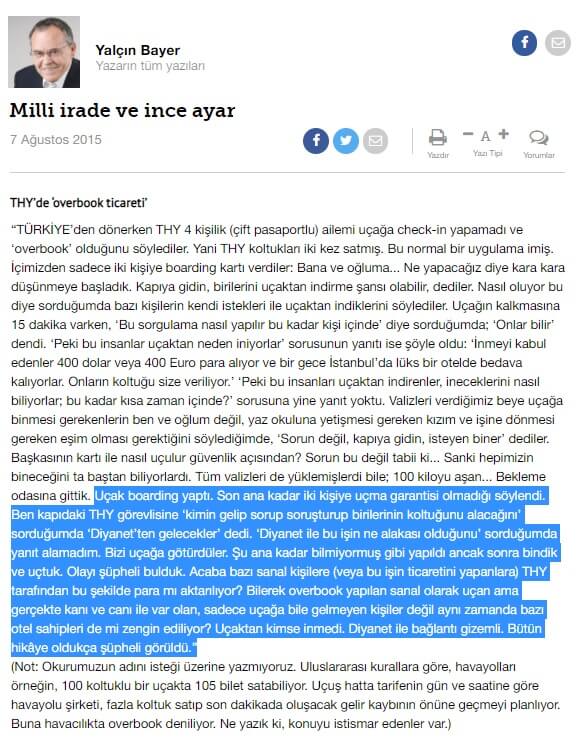 “‘THY’de overbook ticareti’ (7.8.2015) başlıklı yazımıza THY Basın Müşaviri Dr. Ali Genç cevap vererek, ‘Yazınızda ‘diyanet’ olarak ifade edilen husus ‘denied’ yani uçuşa alınamayan yolcu olarak tabir ettiğimiz fazla satış nedeniyle dayanışma sistemidir’ dedi.”