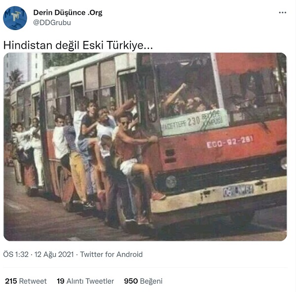 Tıka basa dolu olan, hatta kapıdan dışarı taşan insan kitlelerini taşıdığı iddia edilen otobüsün, AK Parti’nin iktidara gelmesi öncesinde belediye ulaştırma sistemlerinde yer aldığını iddia eden sosyal medya paylaşımı şu şekilde: