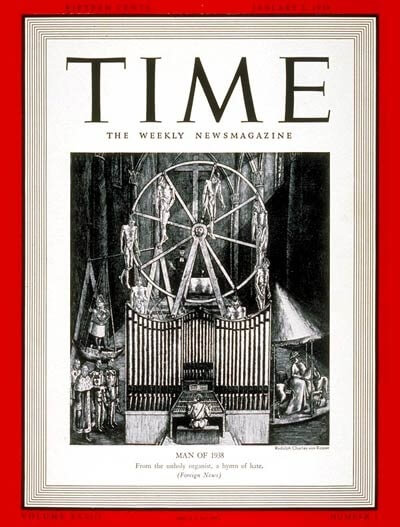 “1938 yılının kişisi” seçilen Hitler, derginin 2 Ocak 1939 tarihli kapağında korkunç bir orgu çalarken gösteren çizimle “Kutsal olmayan orgcudan bir nefret ilahisi” (“From the unholy organist, a hymn of hate.”) alt başlığıyla yer aldı.