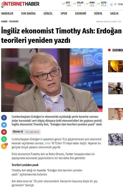 Bazı basın organları, İngiliz ekonomist Timothy Ash’in “Batılı ünlü ekonomistler olarak tüm zamanımızı ekonomi öğrenmeye harcamışız. Erdoğan tüm teorileri yeniden yazdı.” şeklindeki sarkastik paylaşımını gerçek addedip haberleştirmişti.