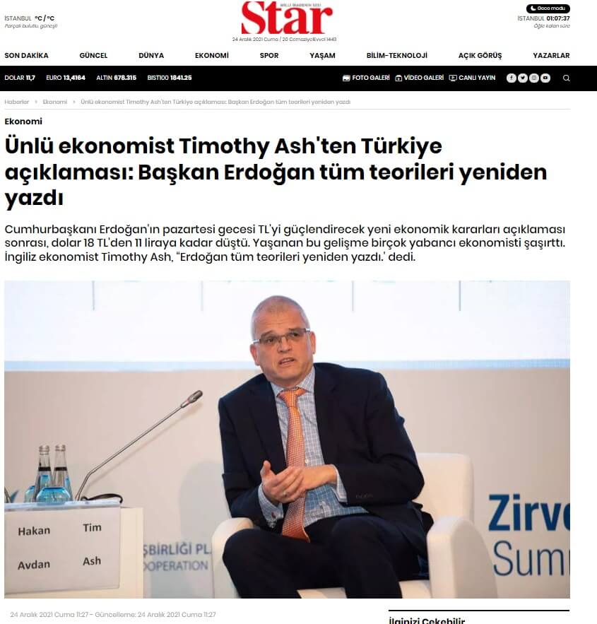 Ünlü ekonomist Timothy Ash’ten Türkiye açıklaması: Başkan Erdoğan tüm teorileri yeniden yazdı Cumhurbaşkanı Erdoğan’ın pazartesi gecesi TL’yi güçlendirecek yeni ekonomik kararları açıklaması sonrası, dolar 18 TL’den 11 liraya kadar düştü. Yaşanan bu gelişme birçok yabancı ekonomisti şaşırttı. İngiliz ekonomist Timothy Ash, “Erdoğan tüm teorileri yeniden yazdı.’ dedi.