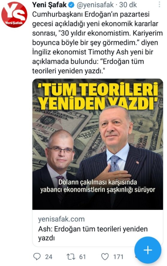 Timothy Ash, Twitter’da yaptığı paylaşımında -kendisi de dahil olmak üzere- batılı ekonomistlerin aptal olduğunu, ekonomi öğrenmek için yıllarını boşa zaman harcadığını ve Erdoğan’ın tüm teorileri baştan yazdığını belirtmişti. Ancak, bu açıklama aslında alaycı bir üslupla kaleme alınmıştı.