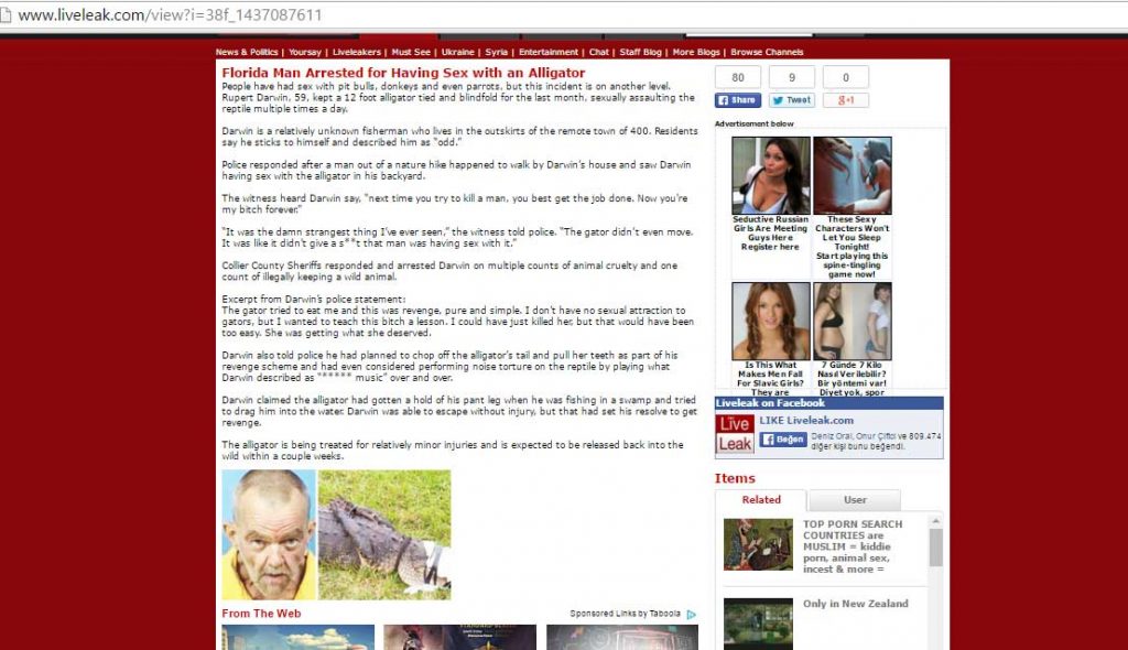 2015 yılı Temmuz ayında Liveleak.com adlı internet sitesinde yayımlanan bir haberde Florida’da bir erkeğin timsaha tecavüz ettiği öne sürülmüştü. Bu iddia Türkiye’den sosyal medya kullanıcılarınca gerçek sanılarak paylaşılmıştı. Snopes bu iddianın gerçeği yansıtmadığını ortaya koymuştu.