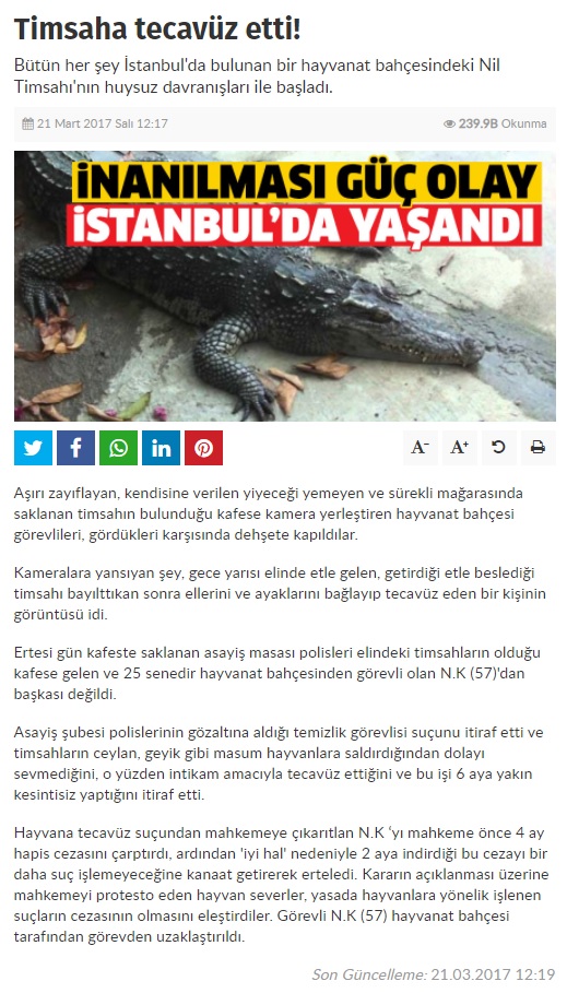 İstanbul’da faaliyet gösteren bir hayvanat bahçesinde timsaha tecavüz edildiği, timsaha tecavüz eden görevlinin yakalandığı; ancak, soruşturma neticesinde serbest bırakıldığı, mütecavizin timsaha diğer hayvanlara saldırdığı için intikam amacıyla tecavüz ettiğini beyan ettiği yönündeki anlatı aslında bir parodi metin.