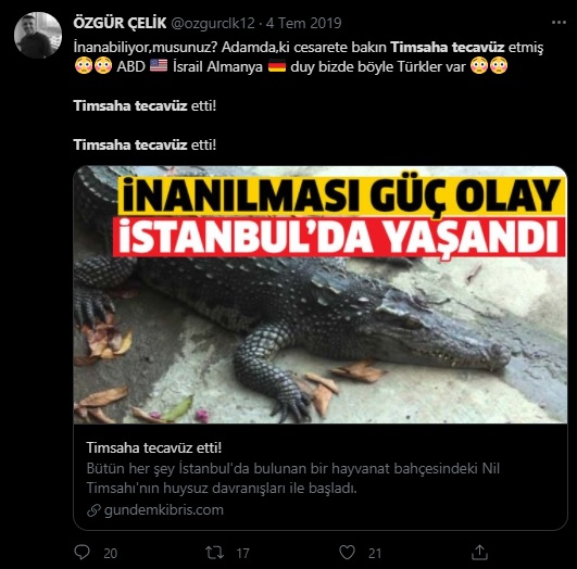 Parodi habere dayandığı ortaya konulmasına rağmen hâlâ sosyal sosyal medyada paylaşılan İstanbul’da bir hayvanat bahçesindeki timsaha tecavüz edildiği yönündeki absürt iddiaya değinme gereği hissettik.