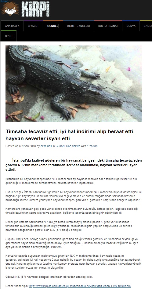 Kirpice.com’da yayımlanan 5 Nisan 2016 tarihli “Timsaha tecavüz etti, iyi hal indirimi alıp beraat etti, hayvan severler isyan etti” başlıklı parodi metin şu şekildeydi: