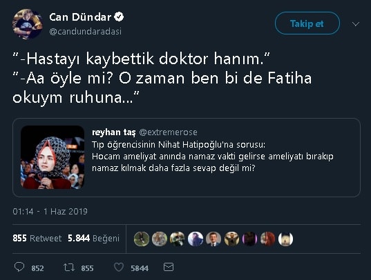 Cumhuriyet ve Milliyet Gazeteleri eski köşe yazarı Can Dündar’ın Twitter profilinde 1 Haziran 2019 tarihinde bu iddiayı ““-Hastayı kaybettik doktor hanım.” “-Aa öyle mi? O zaman ben bi de Fatiha okuym ruhuna…”” notuyla paylaştığı görülüyor.