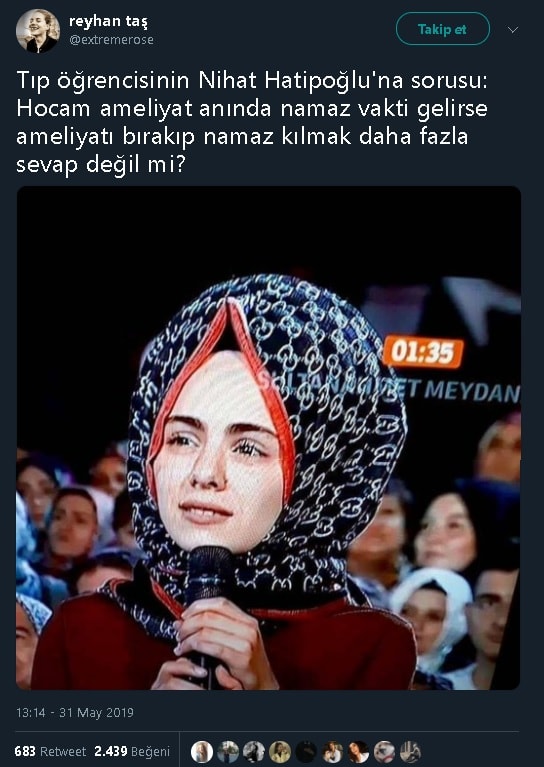 Öte yandan, 27 Mayıs 2019 günü yayınlanan “Nihat Hatipoğlu ile Sahur” adlı programda Tıp Fakültesi 5. sınıf öğrencisi olduğunu belirten Merve adlı (tesettürsüz) başka bir bayanın bu soruyu Nihat Hatipoğlu’na yönelttiği görülmüştür.