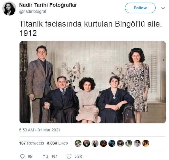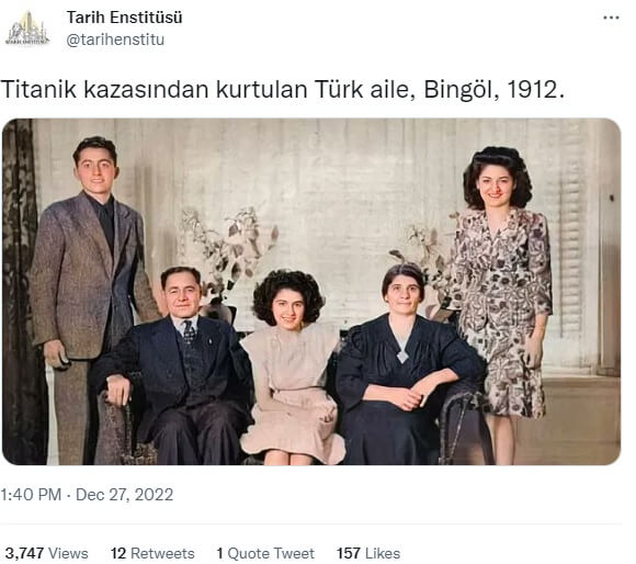 İlk seferinde 15 Nisan 1912 gecesi bir buz dağına çarparak batan RMS Titanik’ten kurtulan Bingöllü ailenin 1912 yılında kaydedilen fotoğrafı olduğu iddiasıyla aşağıdaki görselin paylaşıldığına şahit oluyoruz.