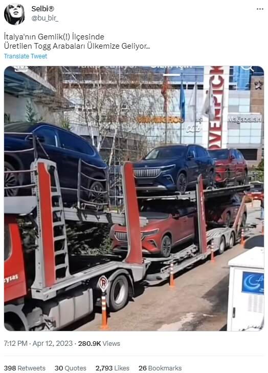 Selbi (@bu_bir_): “İtalya’nın Gemlik(!) İlçesinde Üretilen Togg Arabaları Ülkemize Geliyor..”
