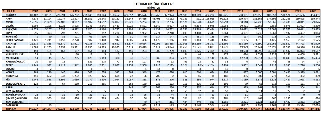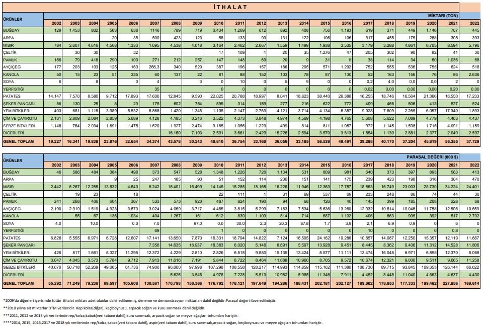 2002-2022 yılları arasında tür bazında yıllık tohum üretim ve ithalat verileri şu şekilde: