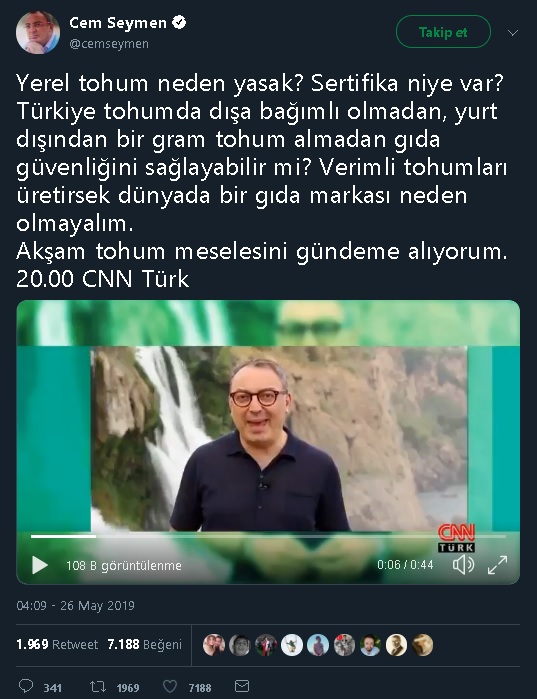 Cem Seymen: “Yerel tohum neden yasak? Sertifika niye var? Türkiye tohumda dışa bağımlı olmadan, yurt dışından bir gram tohum almadan gıda güvenliğini sağlayabilir mi? Verimli tohumları üretirsek dünyada bir gıda markası neden olmayalım. Akşam tohum meselesini gündeme alıyorum. 20.00 CNN Türk”