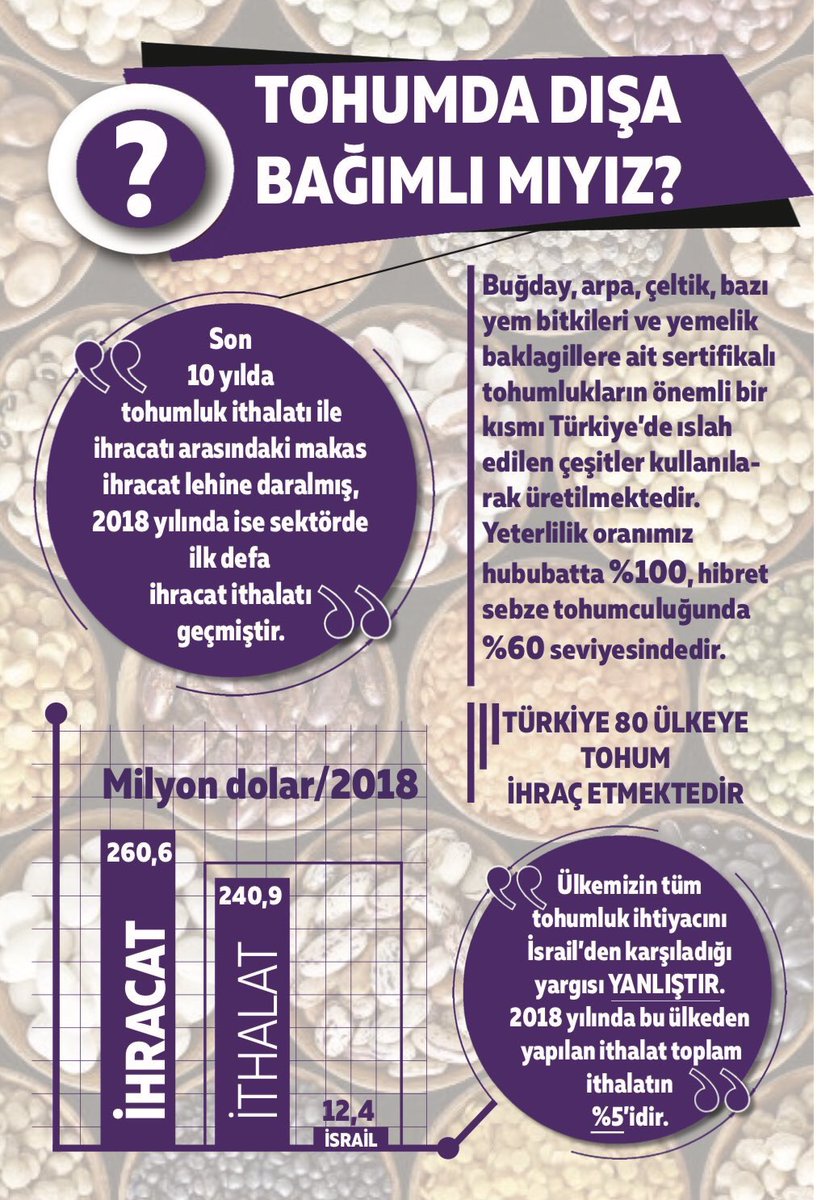Türkiye Tohumcular Birliği (TÜRKTOB), buğday, arpa, çeltik, bazı yem bitkileri ve yemelik baklagillere ait sertifikalı tohumların önemli bir kısmının Türkiye’de ıslah edilen çeşitler kullanılarak üretildiğini, yeterlilik oranımızın hububatta %100, hibrit sebze tohumculuğunda %60 seviyesinde olduğunu, tohumluk ithalatı ile ihracatı arasındaki makasın ihracat lehine daraldığını, ülkemizin tohumluk ihtiyacını İsrail’den karşıladığı iddiasının gerçeği yansıtmadığını, İsrail’den yapılan tohum ithalatının %5’ten az paya sahip olduğunu, 80 ülkeye tohum ithal edildiğini duyurdu.