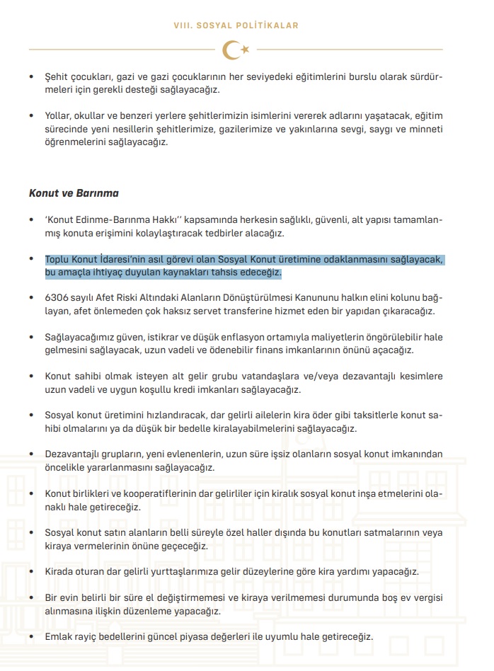 “Sosyal Politikalar başlıklı “Sosyal Yardımlar, Sosyal Hizmetler, Sosyal Güvenlik ve Çalışma Hayatı” alt başlıklı bölümde TOKİ’nin sosyal konut üretimine odaklandırılacağı taahhüdü şöyle aktarılmış: