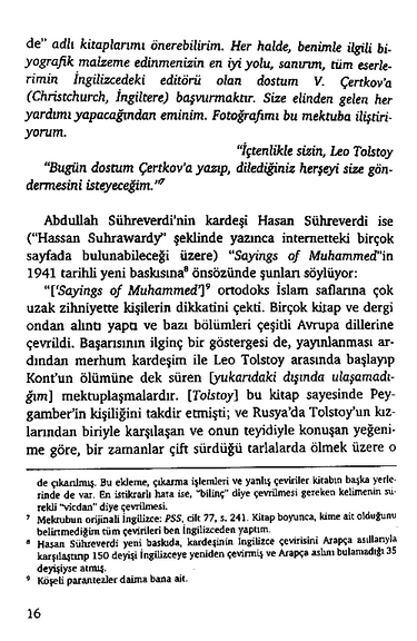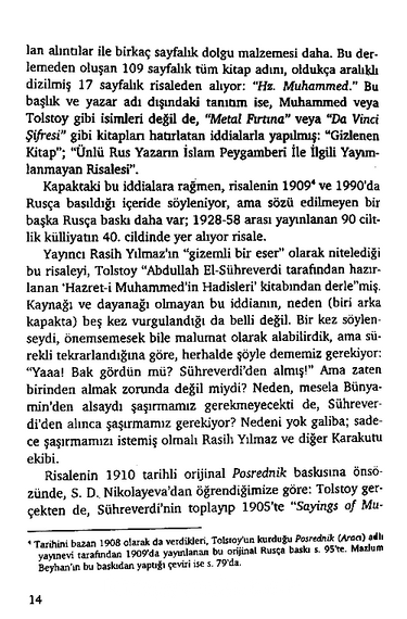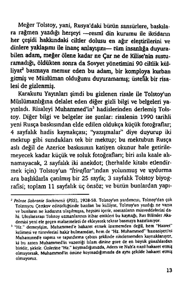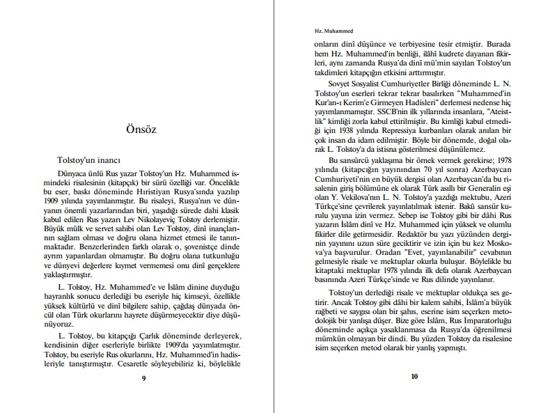 Söz konusu kitapta Lev Tolstoy’un Tolstoy’un ölmeden bir yıl önce Hz Muhammed’in hadislerini derlediği, Tolstoy’un kitabının Rus halkında İslam’a karşı ilgi uyandırmaması için saklandığı, Müslüman gibi defnedilmeyi vasiyet ettiği iddia edilmişti (Hz. Muhammed. 2005. Çev. Arif Arslan. Karakutu Yayınları. İstanbul). Ayrıca, Tolstoy’un İstanbul üzerinden Mekke’ye Hacc vazifesini yerine getirmek üzere hareket ettiği de ileri sürülmüştü.