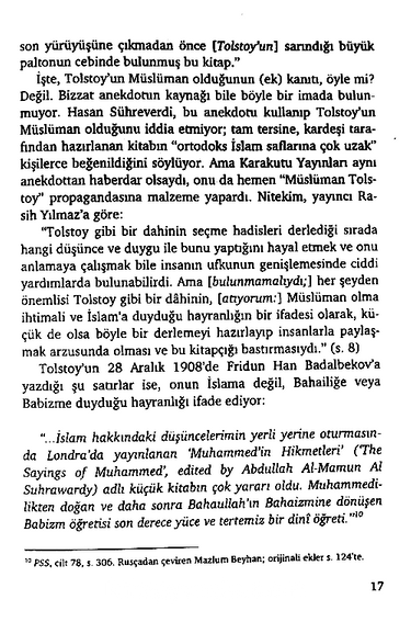 Lâkin, Tolstoy’un din anlayışı üzerine yapılan incelemeler Tolstoy’un Müslüman olduğu, İslam’ın diğer dinlerden üstünlüğünü anlatmak için Abdullah El-Sühreverdi’ye ait bir hadis kitabından seçtiği hadislerle bir eser kaleme aldığı iddialarını kanıtlayacak bir bilgi bulunmadığını ortaya koymaktadır.