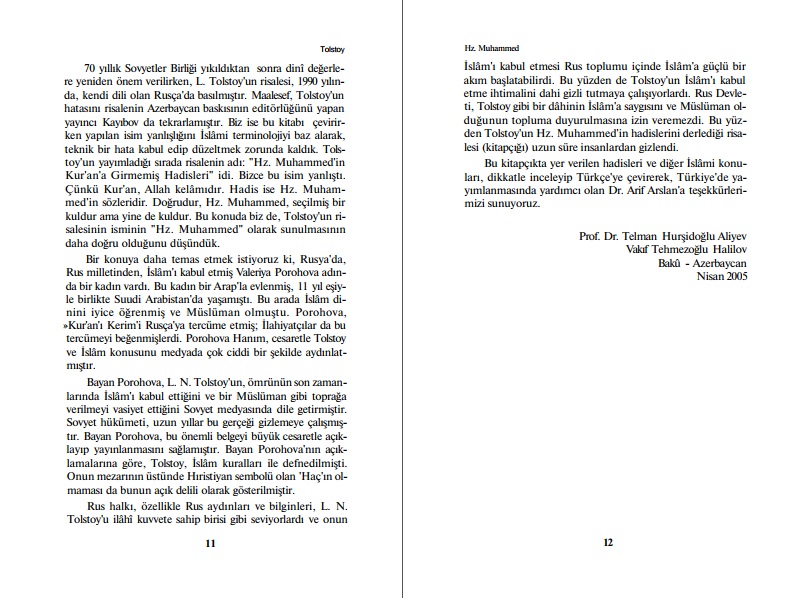“[Hz. Muhammed] Tolstoy” adlı kitabı Rusça’dan Azerbaycan Türkçesine çevirdiği belirtilen Telman Hurşidoğlu Aliyev Vakıf Tehmezoğlu Halilov’un önsözü şu şekildeydi (Karakutu Yay. Sf. 9-12):