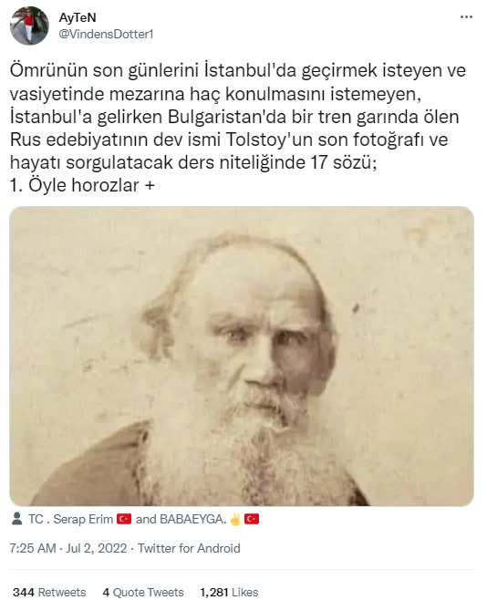 “Ömrünün son günlerini İstanbul’da geçirmek isteyen ve vasiyetinde mezarına haç konulmasını istemeyen, İstanbul’a gelirken Bulgaristan’da bir tren garında ölen Rus edebiyatının dev ismi Tolstoy’un son fotoğrafı ve hayatı sorgulatacak ders niteliğinde 17 sözü”