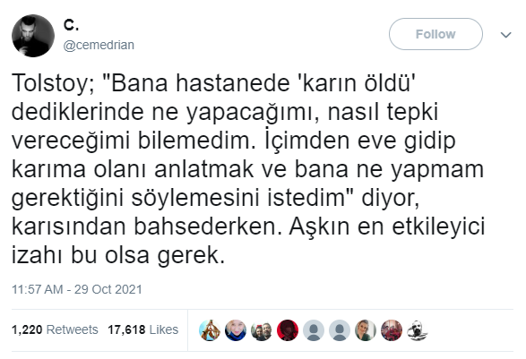 ““Bana hastanede “ Karın öldü !” dediklerinde ne yapacağımı, nasıl tepki vereceğimi bilemedim, içimden eve gidip karıma olanı anlatmak ve bana ne yapmam gerektiğini söylemesini istedim” – Tolstoy Aşk daha güzel anlatılamazdı.”