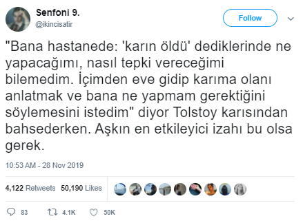 “Tolstoy; “Bana hastanede ‘karın öldü’ dediklerinde ne yapacağımı, nasıl tepki vereceğimi bilemedim. İçimden eve gidip karıma olanı anlatmak ve bana ne yapmam gerektiğini söylemesini istedim” diyor, karısından bahsederken. Aşkın en etkileyici izahı bu olsa gerek.”