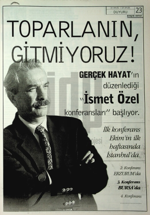 “Toparlanın Gitmiyoruz!” sloganı, (bahse konu dönemde Levent Gültekin’in sahibi olduğu) Gerçek Hayat adlı dergi tarafından 2001 yılında başlatılan, İsmet Özel’in konuşma yaptığı konferans serisinin adıydı.