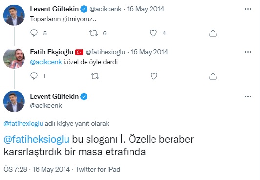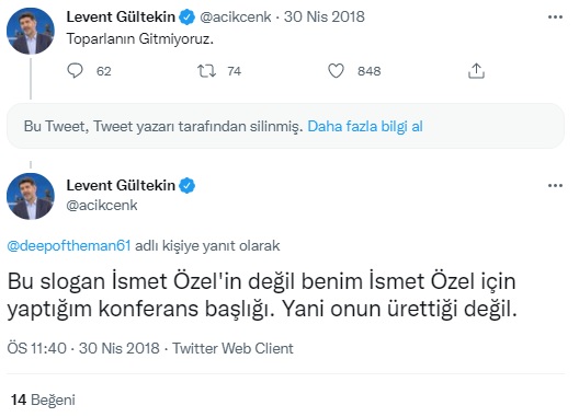 Levent Gültekin, başka bir paylaşımında ise “toparlanın gitmiyoruz” sözü için ” bu sloganı İ. Özelle beraber karsrlaştırdık bir masa etrafında” ifadelerini kullanmıştı.