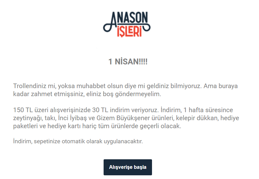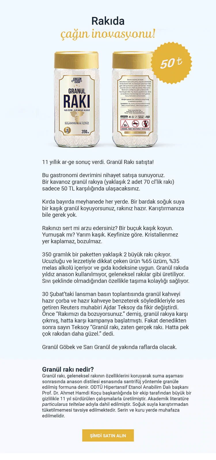 Anason İşleri’nin internet sitesindeki “Bu gastronomi devrimini nihayet satışa sunuyoruz. Bir kavanoz granül rakıya (yaklaşık 2 adet 70 cl’lik rakı) sadece 50 TL karşılığında ulaşacaksınız” notunu içeren sayfadaki bağlantıyı tıklayanlar “1 Nisan” başlıklı bir sayfaya yönlendirilmişti.