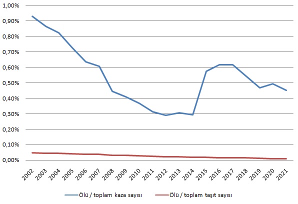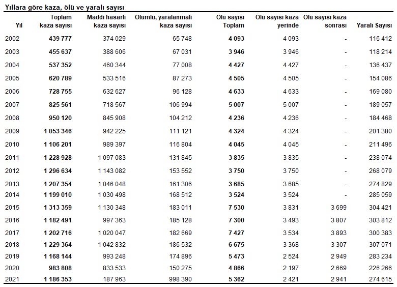 2021 yılı Karayolu Trafik Kaza İstatistiklerine göre 2021 yılında meydana gelen toplam 1 milyon 186 bin 353 adet trafik kazasının 187 bin 963 adedi ölümlü yaralanmalı trafik kazasıydı. 2002 yılında meydana gelen toplam 439 bin 777 kazanın 65 bin 748’i ölümlü yaralanmalı trafik kazasıydı. 2002 yılında trafik kazalarında 4093 kişi yaşamını yitirirken 2021 yılında 5362 kişi yaşamını yitirmişti.