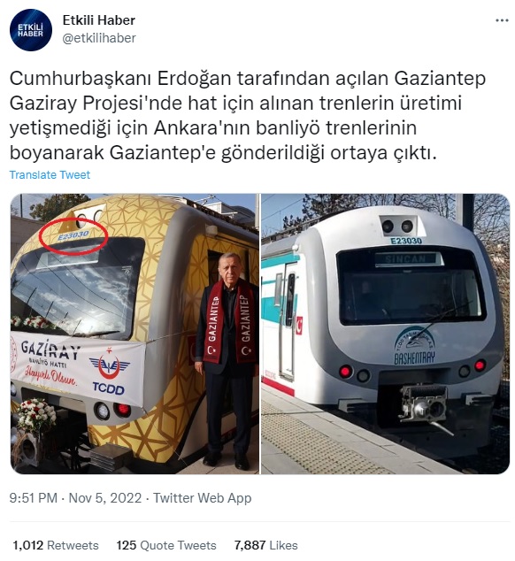 “Cumhurbaşkanı Erdoğan tarafından açılan Gaziantep Gaziray Projesi’nde hat için alınan trenlerin üretimi yetişmediği için Ankara’nın banliyö trenlerinin boyanarak Gaziantep’e gönderildiği ortaya çıktı.”