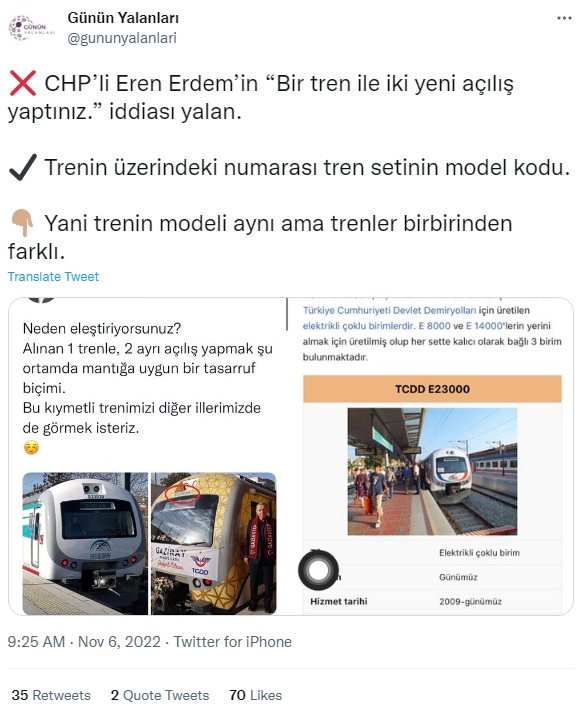 Günün Yalanları adlı Twitter hesabı “Trenin üzerindeki numarası tren setinin model kodu, Yani trenin modeli aynı ama trenler birbirinden farklı” iddiasında bulunmuştu.