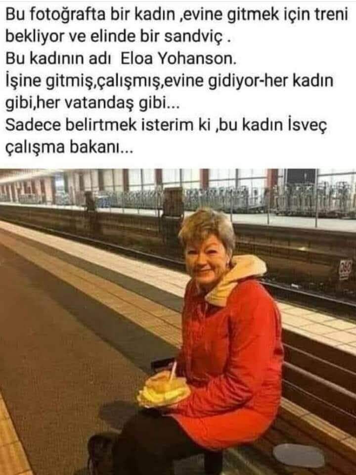 Çocuklar Kalbim (@SevindikSabiha): “işine gitmiş,çalışmış her kadın gibi evine gitmek üzere elinde sandviçle tren bekliyor. bu hanımefendi, kişi başı 56000 dolar olan isveç’in çalışma bakanı eloa johanson..#alıntı#”