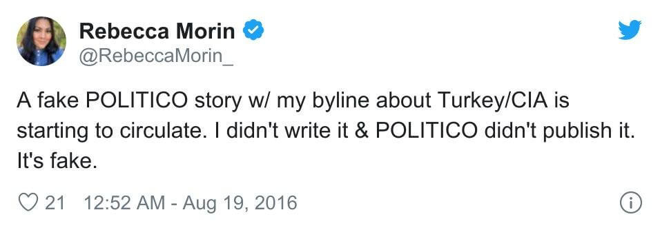 “A fake POLITICO story w/ my byline about Turkey/CIA is starting to circulate. I didn’t write it & POLITICO didn’t publish it. It’s fake.”