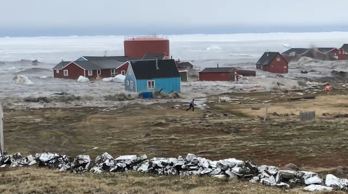 Grönland’daki Nuugaatsiaq adlı yerleşim alanında meydana gelen tsunamide balıkçıların kıyıyı vuran tsunaminin ardından canlarını kurtarmak için kaçmak zorunda kaldıkları an kameralara yansımıştı.