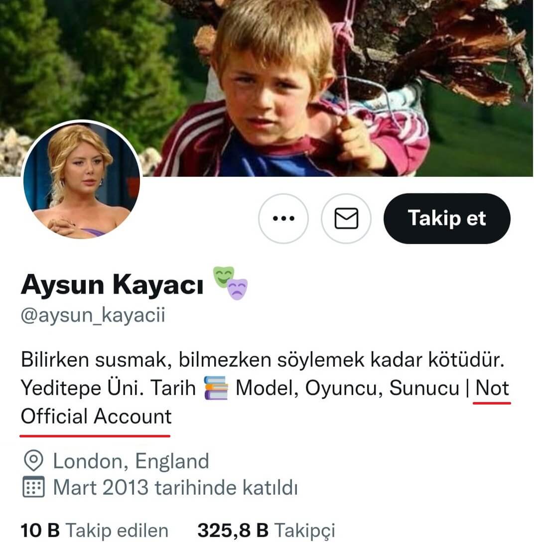 “Aysun_kayacii” uzantılı sahte hesabın da Aysun Kayacı’ya ait olmadığı, profilinde barındırdığı “not official account” ibaresi vasıtasıyla anlaşılabiliyor (Aysun Kayacı’ya ait sanılan “aysun_kayacii” uzantılı hesap da Twitter tarafından kapatılmış).