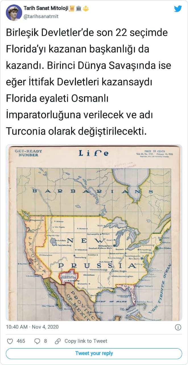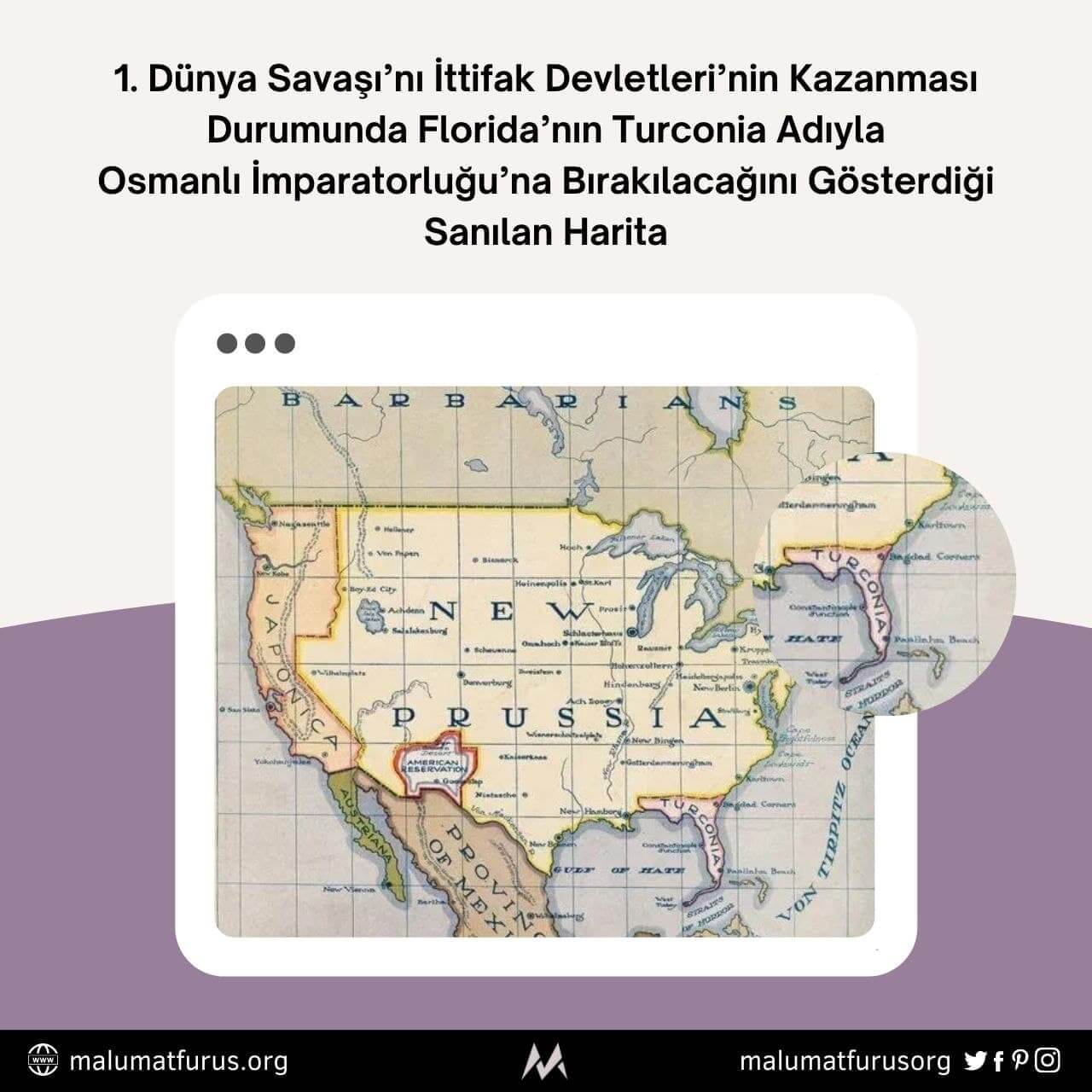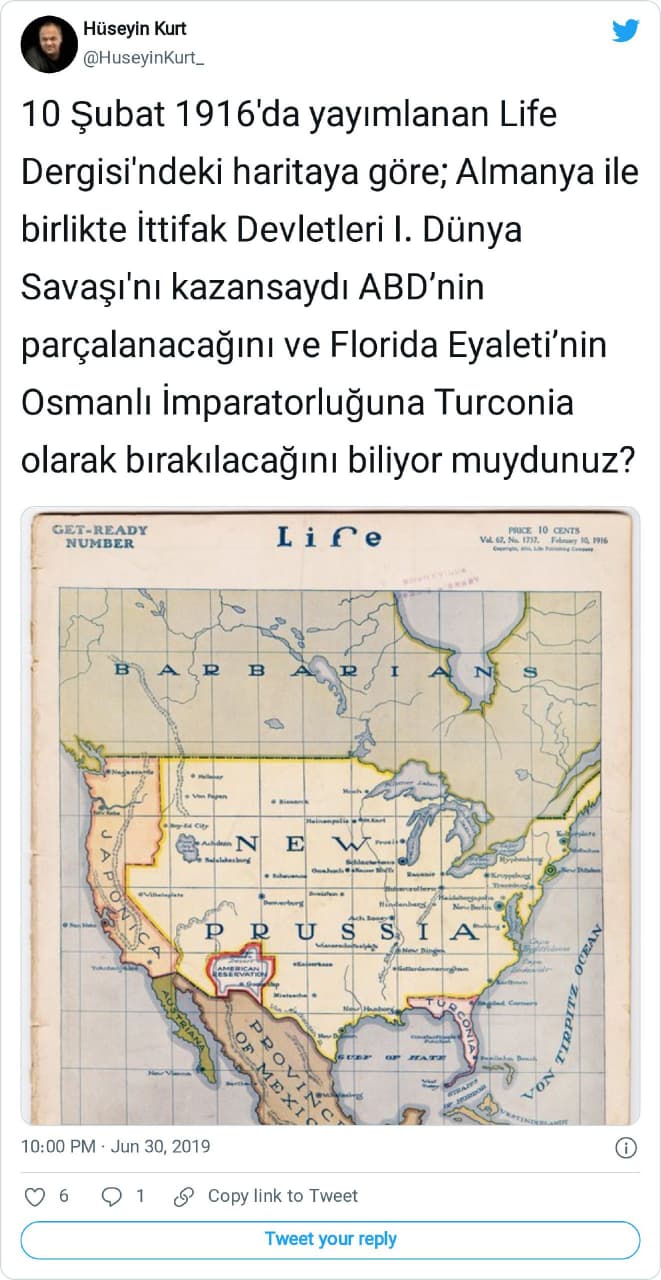 “10 Şubat 1916’da yayımlanan Life Dergisi’ndeki haritaya göre; Almanya ile birlikte İttifak Devletleri I. Dünya Savaşı’nı kazansaydı ABD’nin parçalanacağını ve Florida Eyaleti’nin Osmanlı İmparatorluğuna Turconia olarak bırakılacağını biliyor muydunuz?”